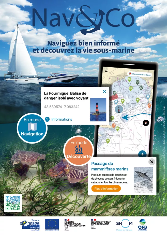"Nav&Co" a été développée en collaboration avec différents organismes d'Etat : l’Office Français de la Biodiversité (OFB), la Direction Générale des Affaires Maritimes, de la Pêche et de l’Aquaculture (DGAMPA) et le Service Hydrologique et Océanographique de la Marine (SHOM). Ainsi sont regroupées sur une seule application les cartes marines, les informations de balisage et de marées et les données environnementales.